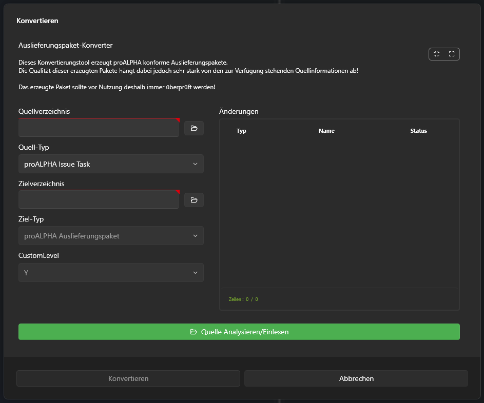 Über die Toolbar kann der Konverter gestartet werden. Der Konverter versucht anhand eines Quellverzeichnisses ein Proalpha konformes Auslieferungspaket zu erzeugen. Erfolgreich konvertierte Pakte können so über den Package-Service automatisch in die Versionsverwaltung importiert werden.