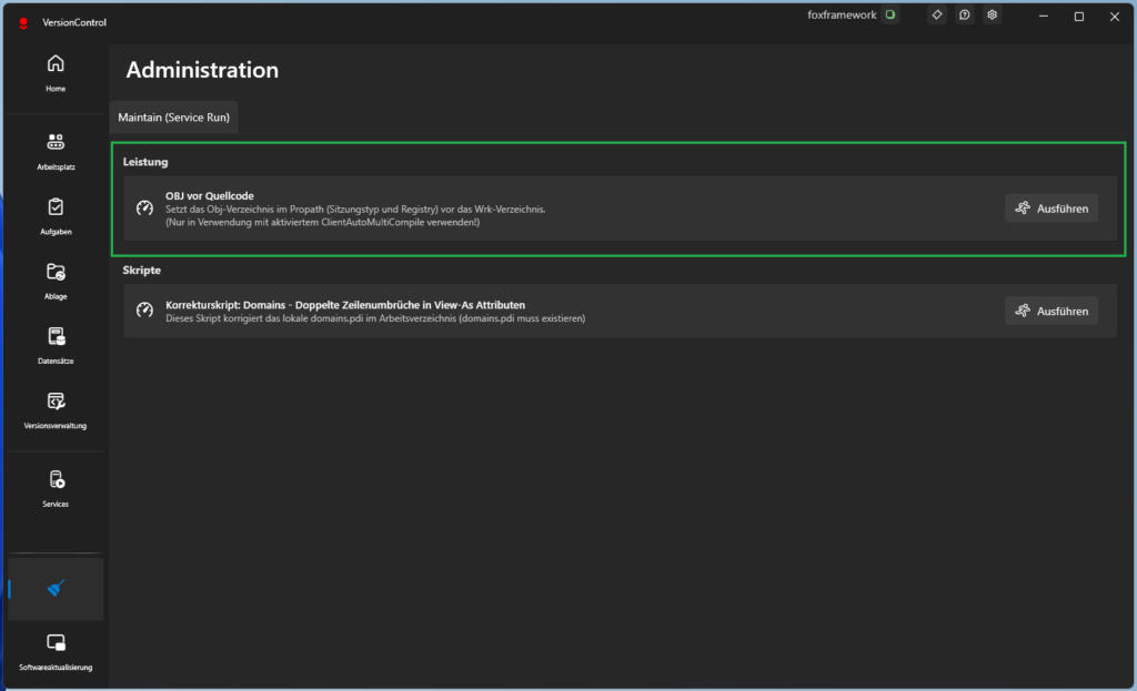 Diese Anpassung an der Startkonfiguration sowie an der Registry kann komfortabel über den Wartungslauf „Obj vor Quellcode“ vorgenommen werden. Hierfür muss die Benutzeroberfläche im Administrationsmodus gestartet werden (siehe Screenshot).